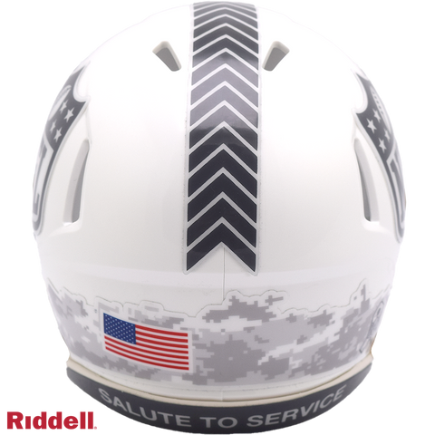 The Salute to Service helmets are inspired by those used by the military for decades, and are meant to honor the memory and selfless sacrifices of service members past and present. Each helmet features team logos, a chevron top stripe pattern, a stencil city name on front bumper, stencil Salute to Service back bumper, US Flag and official Sature to Service Ribbon. Made by Riddell.