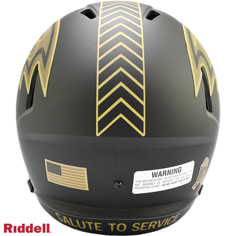 The 2025 NFL Salute to Service helmets are inspired by those used by the military for decades and are meant to honor the memory and selfless sacrifices of service members past and present. Each helmet is painted in a dark green satin finish with black appointments and dark gray face mask. The matte tonal decals match the official 2025 Salute to Service design elements and colorway. A chevron stripe pattern is used on every helmet, along with city name abbreviations on front bumpers, and Salute to Service back bumper decals. The helmet includes the official Salute to Service ribbon and a tonal U.S. flag. Made by Riddell.