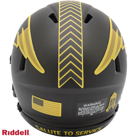 The 2025 NFL Salute to Service helmets are inspired by those used by the military for decades and are meant to honor the memory and selfless sacrifices of service members past and present. Each helmet is painted in a dark green satin finish with black appointments and dark gray face mask. The matte tonal decals match the official 2025 Salute to Service design elements and colorway. A chevron stripe pattern is used on every helmet, along with city name abbreviations on front bumpers, and Salute to Service back bumper decals. The helmet includes the official Salute to Service ribbon and a tonal U.S. flag. Made by Riddell.