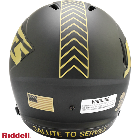 The 2025 NFL Salute to Service helmets are inspired by those used by the military for decades and are meant to honor the memory and selfless sacrifices of service members past and present. Each helmet is painted in a dark green satin finish with black appointments and dark gray face mask. The matte tonal decals match the official 2025 Salute to Service design elements and colorway. A chevron stripe pattern is used on every helmet, along with city name abbreviations on front bumpers, and Salute to Service back bumper decals. The helmet includes the official Salute to Service ribbon and a tonal U.S. flag. Made by Riddell.